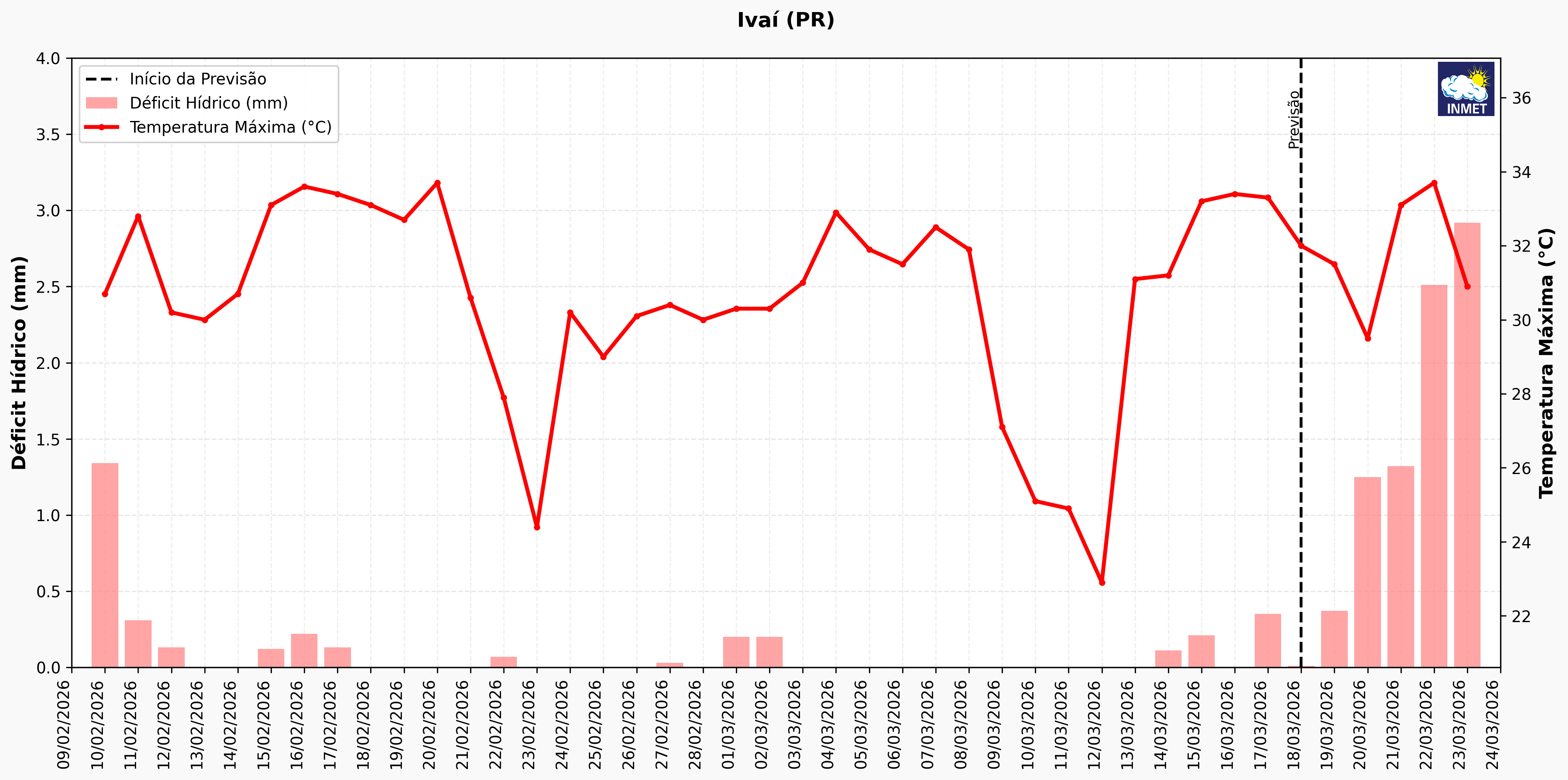 Figura 2: Déficit hídrico e temperatura máxima para o período de 10 de fevereiro a 23 de março de em Ivaí (PR). Fonte: SISDAGRO.