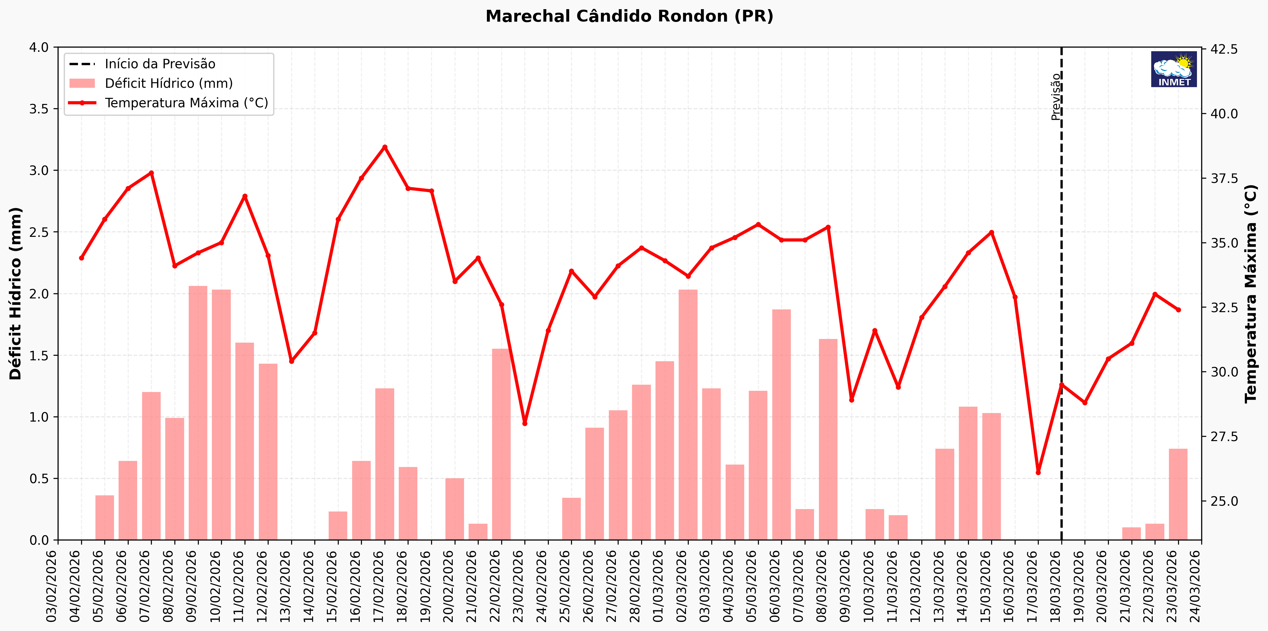 Figura 1: Déficit hídrico e temperatura máxima para o período de 04 de fevereiro a 23 de março em Marechal Cândido Rondon (PR). Fonte: SISDAGRO.