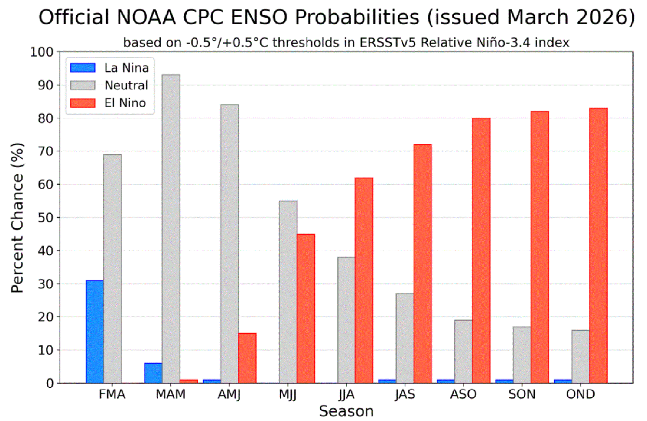 Figura 1. Previsão de probabilidade de El Niño, La Niña e neutralidade em cada trimestre de 2026. Fonte: CPC/NOAA.