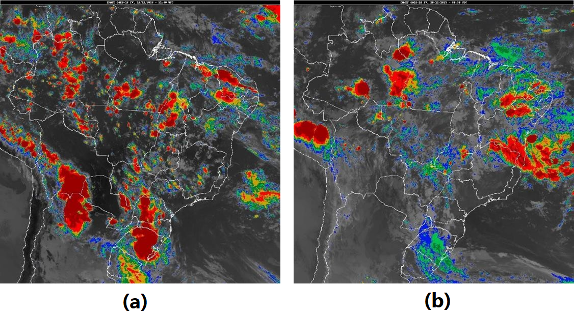 Figura 2: Imagem de satélite dos dias: (a) 18/12/2023 às 21:40UTC (18h40min no horário de Brasília) e (b) 20/12/2023 08:30UTC (5h30 do horário de Brasília).