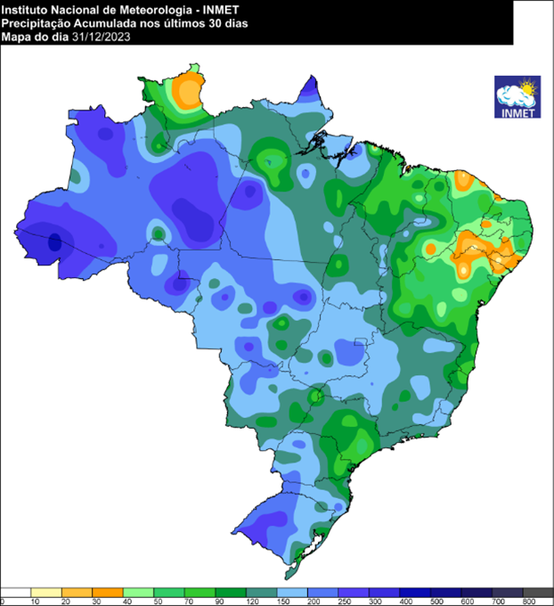 Em dezembro, os maiores acumulados de chuvas (tons em azul no mapa da figura 1) concentraram-se na faixa oeste do País, principalmente no noroeste e sul do Brasil devido à combinação do calor e a alta umidade.