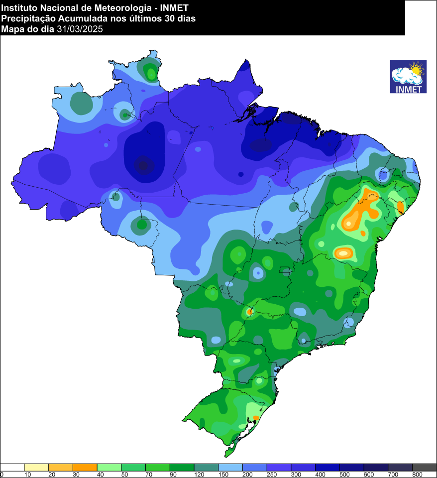 Figura 1 - Mapa do acumulado de precipitação (mm) nos últimos 31 dias de março (áreas mais chuvosas em azul escuro que vai diminuindo o volume de chuva indicado pela gradação do azul claro, passando pelo verde escuro/claro até os tons laranja/amarelo)