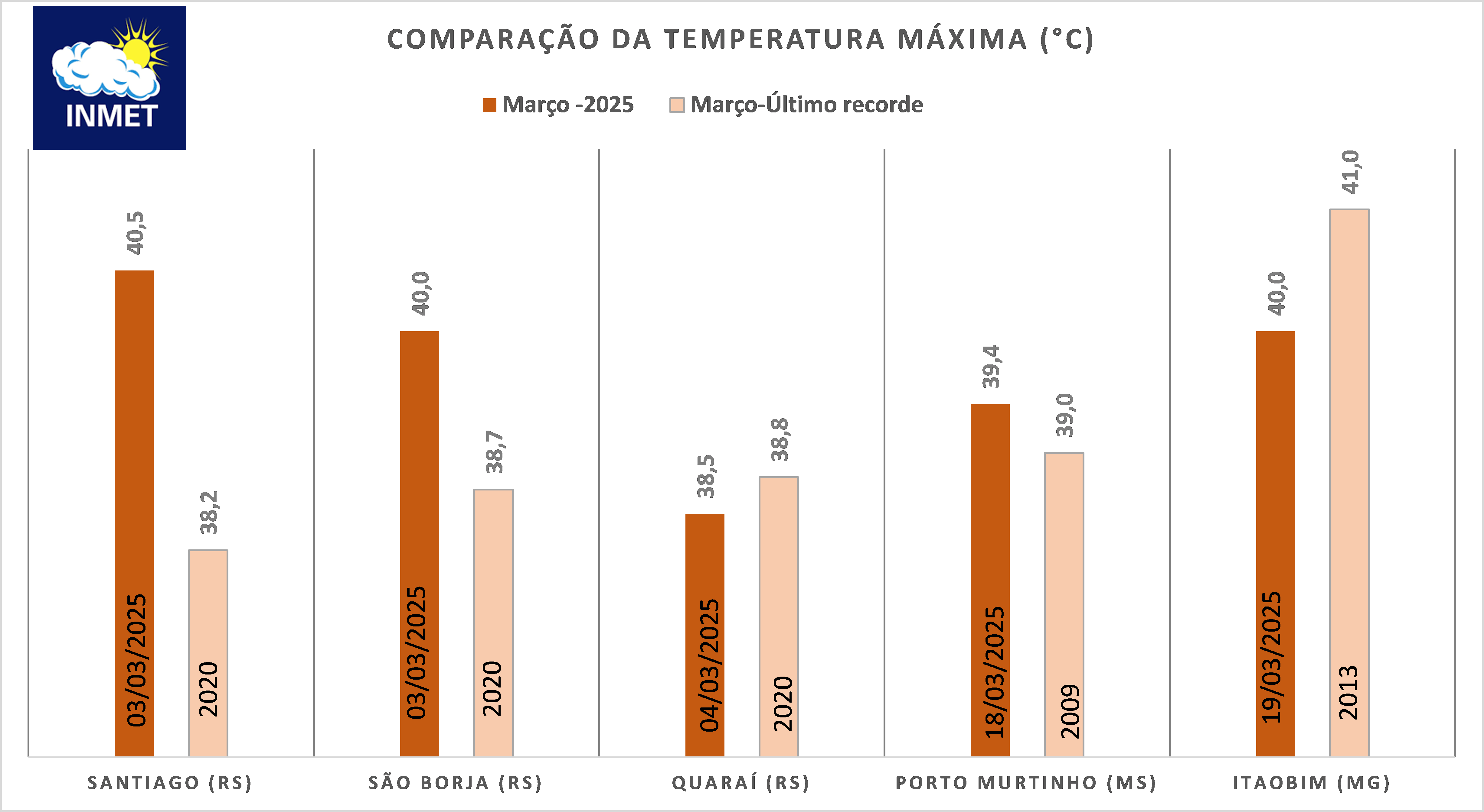 Figura 3: Comparação da Temperatura Máxima (°C) de março de 2025 (laranja escuro) e março - último recorde da série histórica (laranja claro)