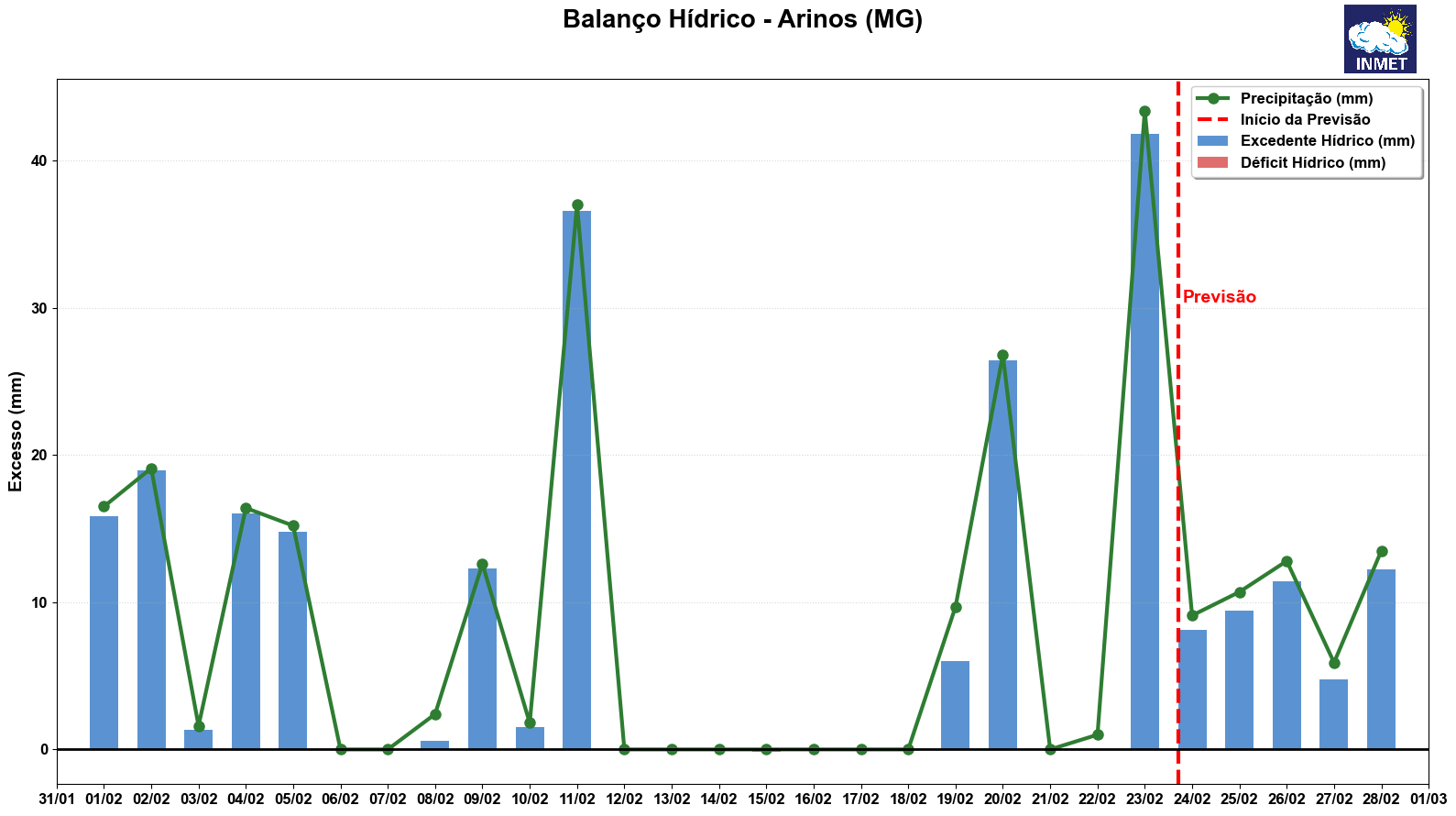 Figura 1: Balanço Hídrico para Arinos (MG) no período de 01 a 28 de fevereiro.