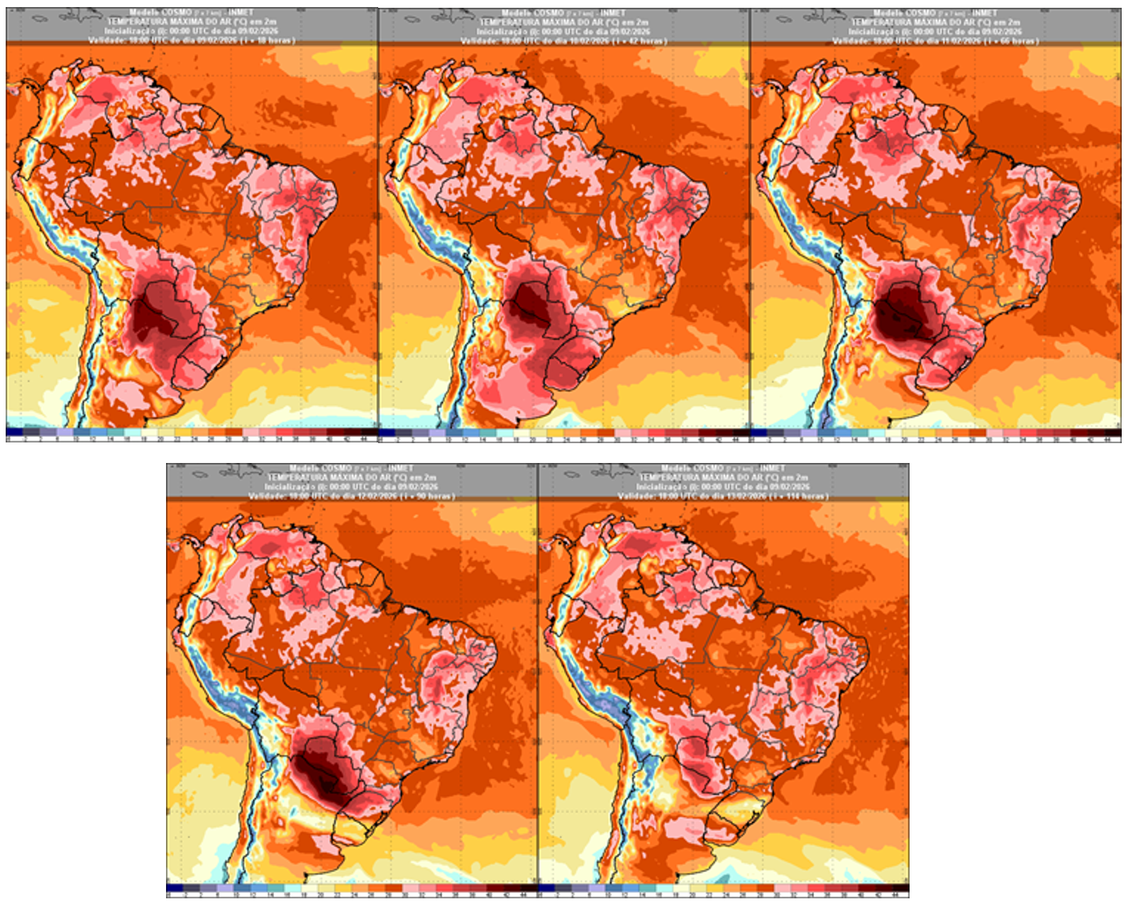 Figura 2: Previsão de temperatura máxima para a semana de 09 a 13 de fevereiro de 2026 às 15h (horário de Brasília). Fonte: INMET
