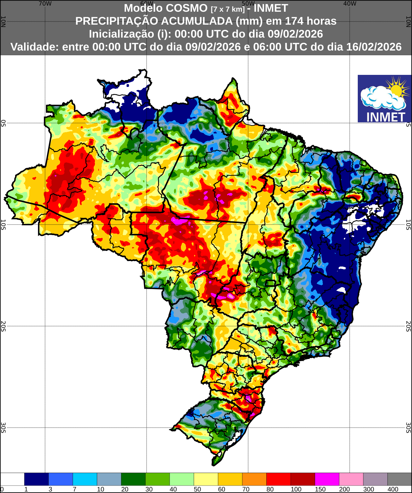 Figura 1: Previsão de chuva acumulada (9 a 16 de fevereiro de 2026). Fonte: INMET