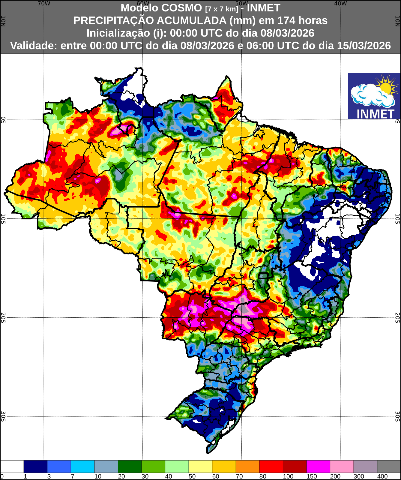 Figura 1: Previsão de chuva acumulada (9 a 16 de março de 2026). Fonte: INMET