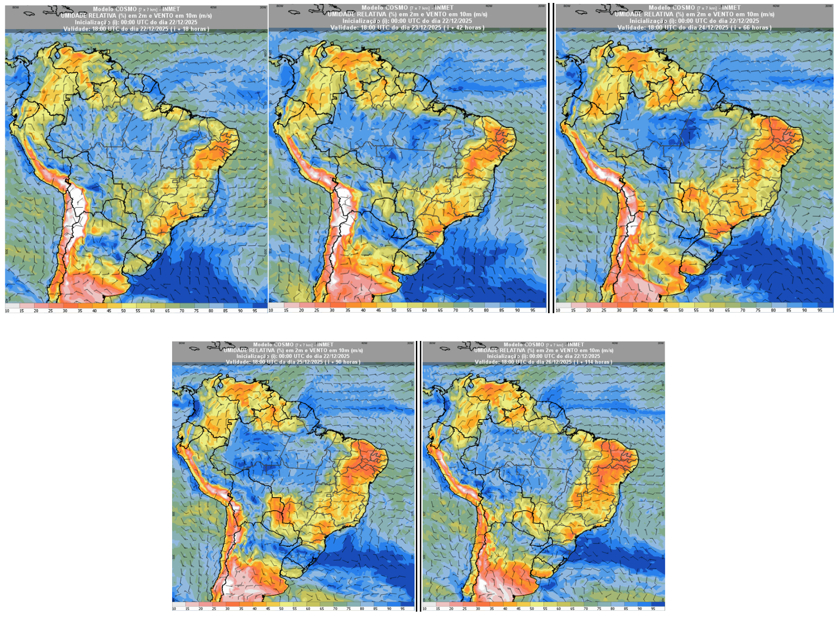 Figura 2: Previsão de umidade relativa do ar (%) em 2 m e vento a 10 m (m/s) para a semana de 22 de dezembro a 26 de dezembro de 2025 às 15h (horário de Brasília). Fonte: INMET