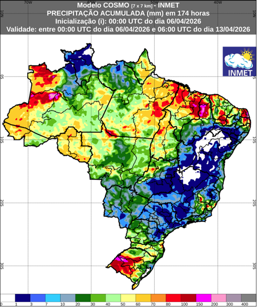 A previsão de chuva acumulada entre os dias 06 e 13 de abril de 2026 é apresentada na Figura 1. De acordo com o modelo numérico do INMET, os maiores acumulados de chuva  na semana são previstos para áreas da Região Norte, Nordeste e Sul do Brasil.