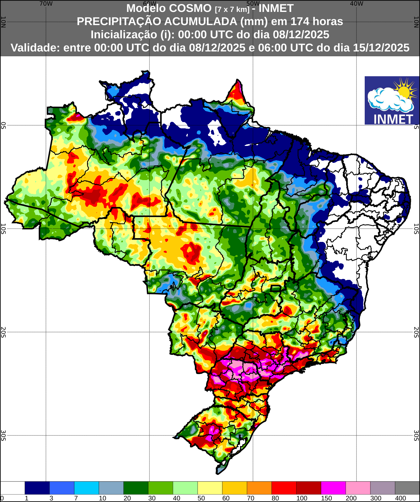 Figura 2: Previsão de chuva acumulada (8 a 14 de dezembro de 2025). Fonte: INMET