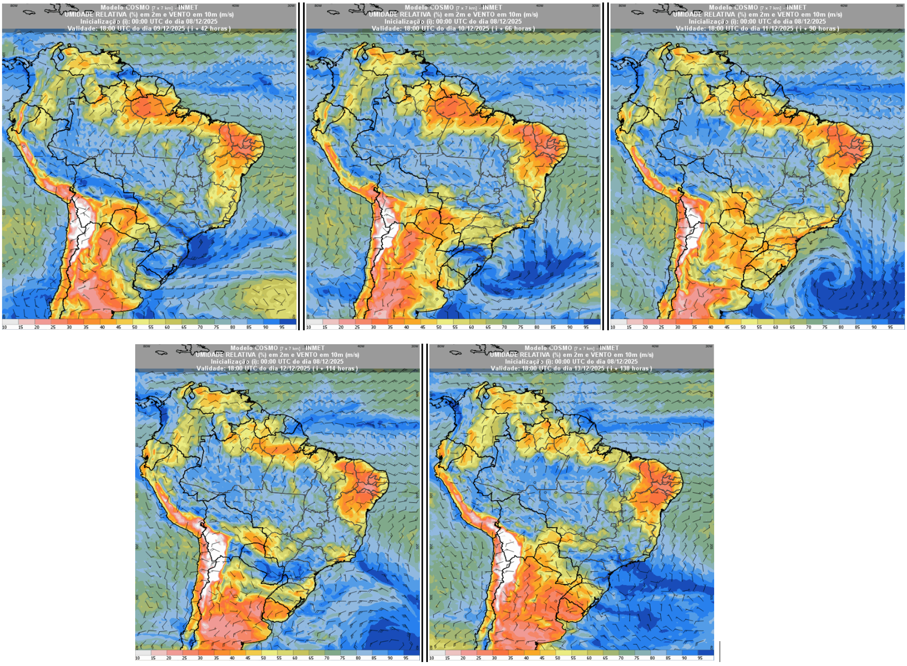 Para a Região Sul, há previsão de chuvas intensas nos dois primeiros dias da semana, principalmente dia 09/12, com maior destaque de volumes de chuva no ramo oeste da região Sul, e no estado do Rio Grande do Sul e Paraná, em razão da configuração e atuação de um ciclone extratropical continental que se forma próximo ao interior dos estados, e está previsto com deslocamento sobre o estado do Rio Grande do Sul, desembocando no Oceano Atlântico. Os acumulados devido a este sistema podem superar os 150 mm (potencialmente 200 mm) em 24h na passagem do dia 08/12 para o dia 09/12, e ao longo do dia 09/12, período de maior concentração das chuvas na região Sul (tons em vermelho e rosa na Figura 2), e há períodos do dia 09 onde as chuvas, com tempestades severas, podem superar os 60 mm/h. No dia 10 ainda haverá condição para continuidade das chuvas no Sul, entretanto os volumes maiores ficarão concentrados na metade leste da região, em função do deslocamento do ciclone extratropical em direção ao oceano Atlântico. Em seguida, do dia 11 em diante, praticamente cessam as ocorrências de chuva de grande escala, podendo ocorrer chuva pontual no litoral dos estados, mas de baixos acumulados, e também pela manhã no estado do RS. Durante a semana a umidade relativa do ar mínima ficará elevada em torno de 70% (tons azuis na figura 3) e decairá para 40-50% no fim da semana (tons em amarelo e vermelho na Figura 3).