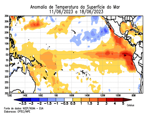 Em junho, as condições de temperatura da superfície do mar mostraram um padrão típico do fenômeno El Niño, apresentando uma extensa faixa de águas quentes em grande parte do oceano, desde a porção central até a costa da América do Sul, com anomalias (diferença entre o valor registrado e a média histórica) de temperatura variando entre 0,5°C e 3,0°C.