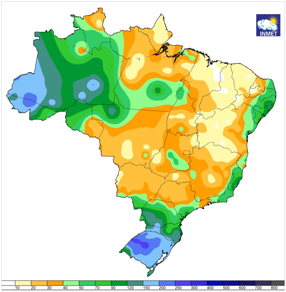 Figura 1 – Mapa do acumulado de precipitação (mm) nos 30 dias de setembro. Tons em azul escuro indicam áreas mais chuvosas, cuja redução de volumes é representada pela gradação do azul claro, passando pelo verde escuro/claro até os tons laranja/amarelo).