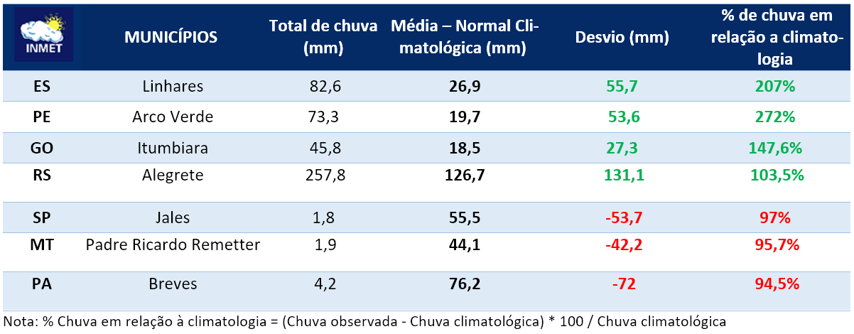 Chuvas expressivas na Região Norte e sul da Região Sul, temperaturas registraram valores acima da média