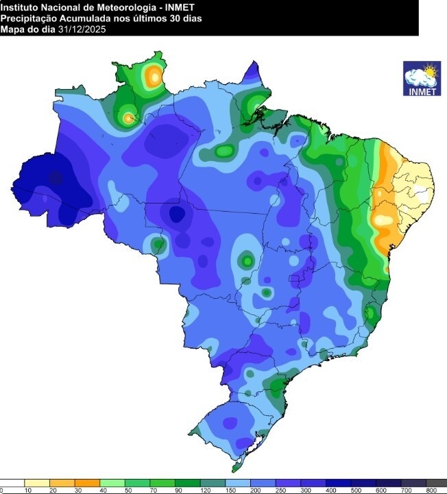 Figura 1 – Mapa do acumulado de precipitação (mm) em dezembro de 2025. Tons em azul escuro indicam áreas mais chuvosas, cuja redução de volumes é representada pela gradação do azul claro, passando pelo verde escuro/claro até os tons de laranja/amarelo.