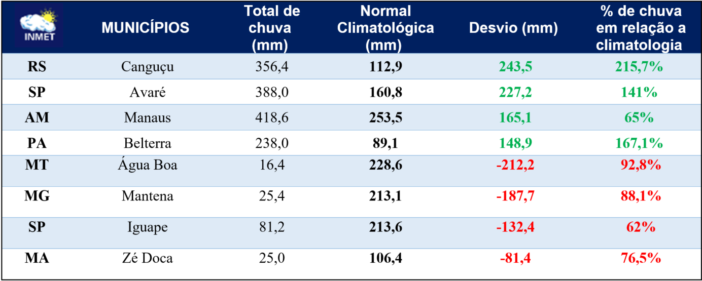 Nota: % Chuva em relação à climatologia = (Chuva observada - Chuva climatológica) * 100 / Chuva climatológica
