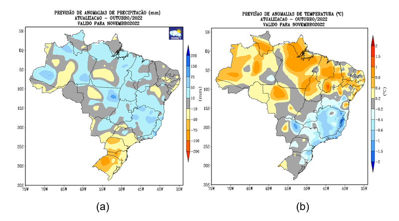 Figura 1: Previsão de anomalias* de (a) precipitação e (b) temperatura média do ar do modelo climático do INMET, para o mês de novembro de 2022.