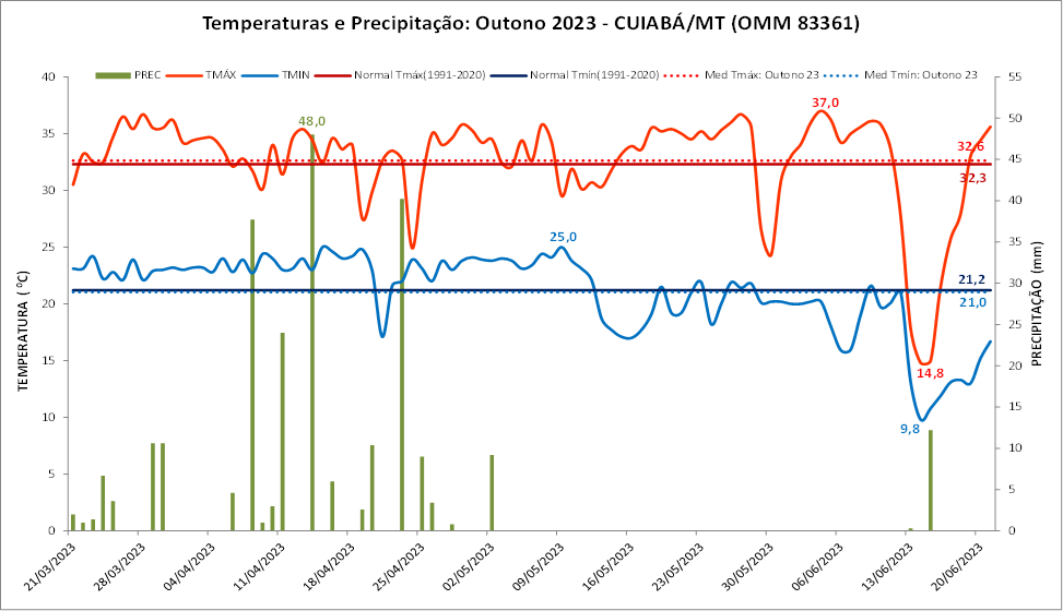 A figura 1 mostra o gráfico com os dados diários das temperaturas e da precipitação (chuva) registrados durante o outono de 2023, em Cuiabá (MT).