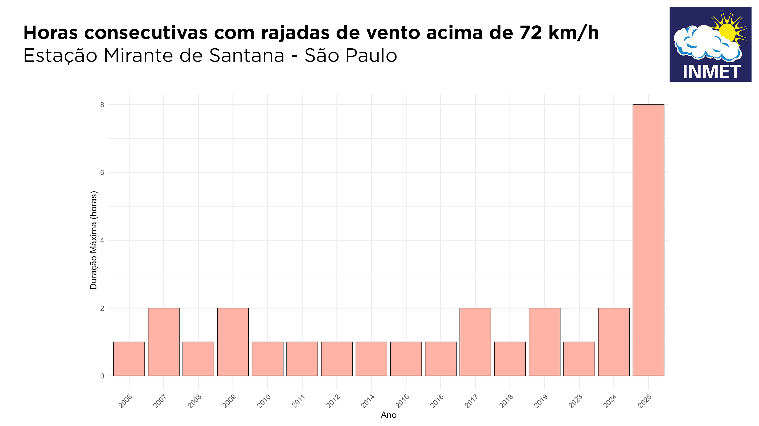 Embora o episódio não tenha superado a rajada máxima de 101 km/h registrada em 2010, esta foi a primeira vez, desde o início das medições em 2006, que a estação do Mirante de Santana observou uma sequência tão prolongada de rajadas de ventos acima de 70 km/h (Figura 1). Em outros eventos de ventania na capital paulista, as rajadas (acima de 70 km/h) ocorreram, no máximo, em dois horários consecutivos.