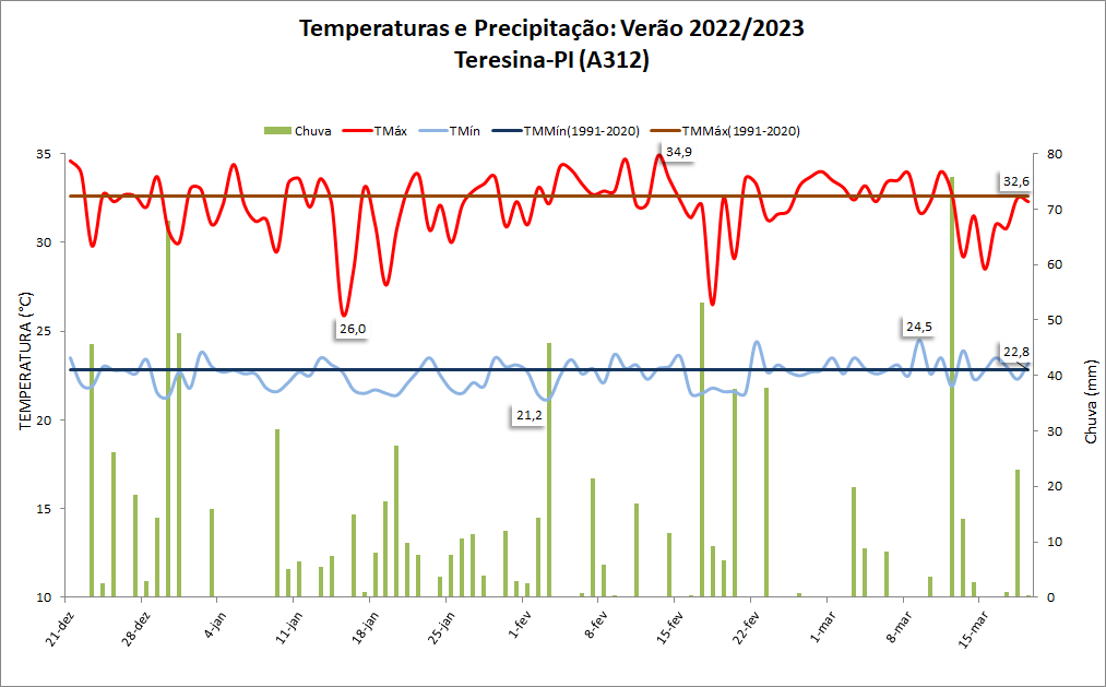 Já a média das temperaturas mínimas foi de 22,6°C, valor 0,2ºC abaixo da média histórica, que é de 22,8°C. Enquanto a menor temperatura mínima diária da estação verão 2022/23 foi de 21,2°C, registrada no dia 3/02. Já a maior temperatura mínima diária foi de 24,5°C, ocorrida no dia 9/03.