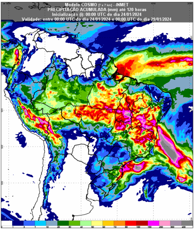 Figura 2: Previsão de precipitação (chuva) acumulada pelo modelo COSMO para o período entre as 00UTC do dia 24 (21h – hora de Brasília do dia 23) as 00UTC do dia 29 (21h – hora de Brasília do dia 28).